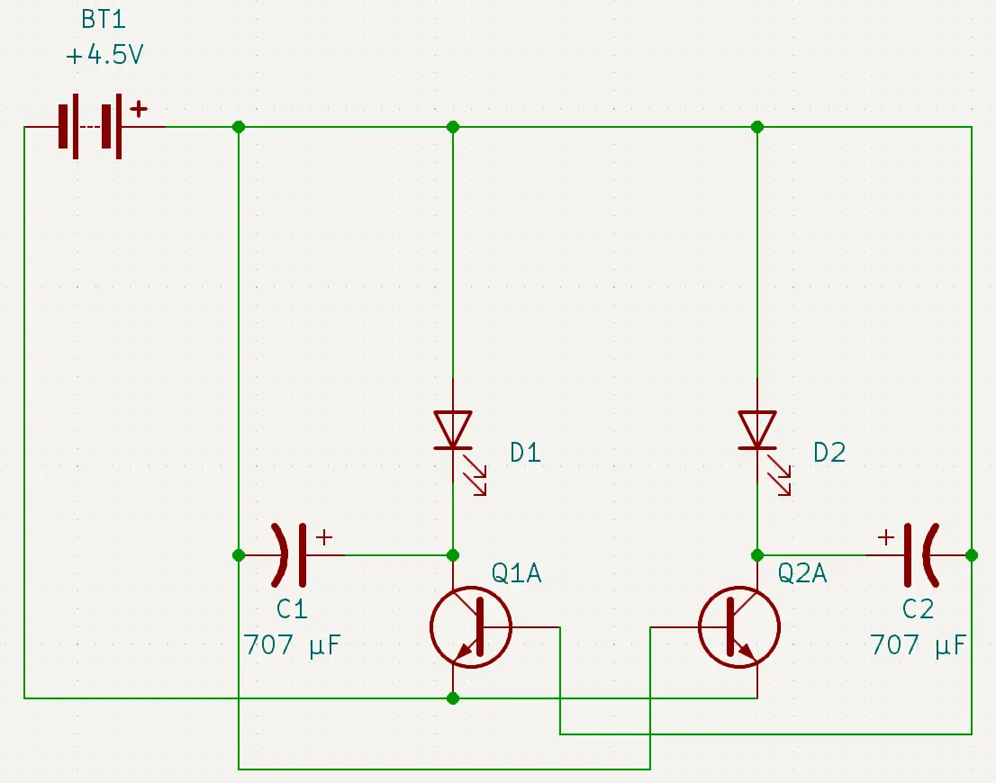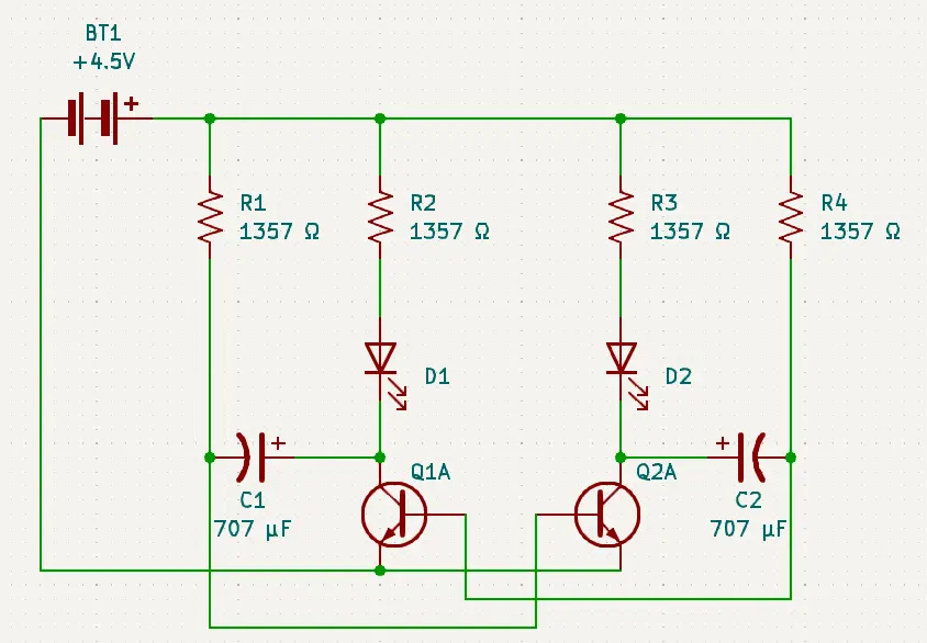 This process will repeat itself for as long as there is power supplied to the circuit, causing the LED (D1) to blink according to the values calculated for the square wave.