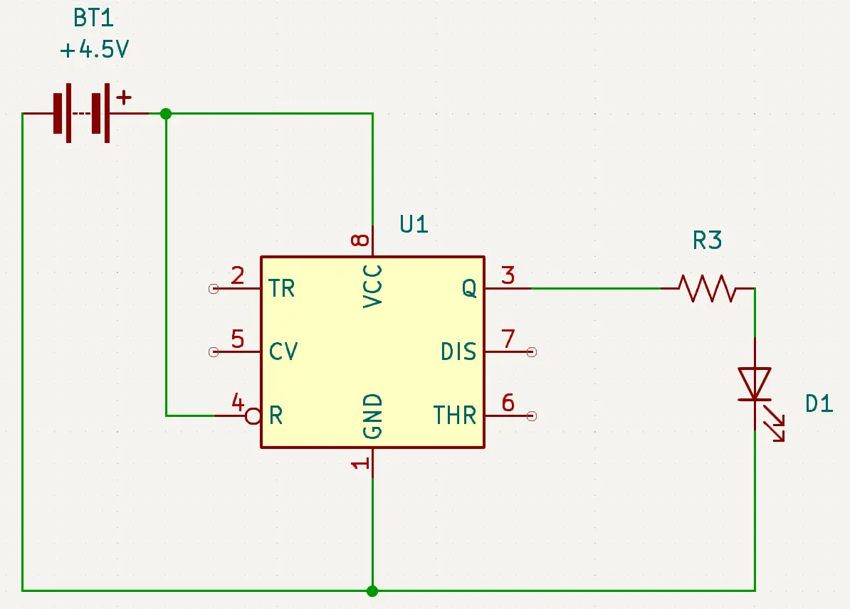 We know that we need to have power (red) go to Vcc (Pin 8), but we also want power (BT1) to go to Reset (Pin 4) as well. The reason that we are supplying power to Reset is that we don't want Reset to go to the ground and reset our IC (U1).